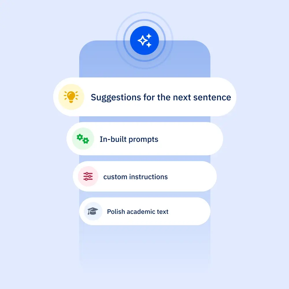 Provide the AI writer with customized prompts to help it generate predictive writing suggestions perfectly tailored to your research focus. - Polish your academic text in minutes